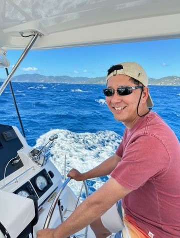 Young man steering a big boat